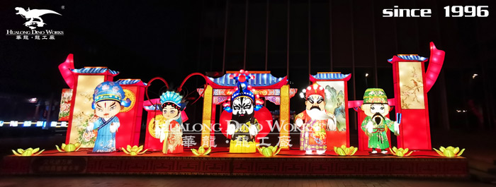 Zigong lantern show production company:Steel frame structure, silk frame modeling,some part with LED hooking,3D modeling,chromatic silk and satin seperated pastin,in magnificent and colorful appearence.