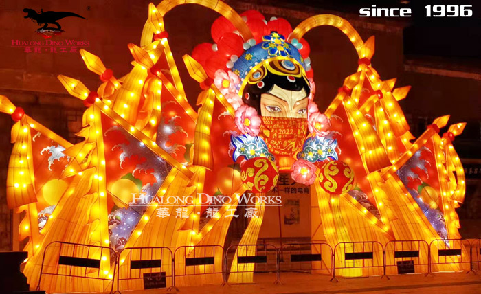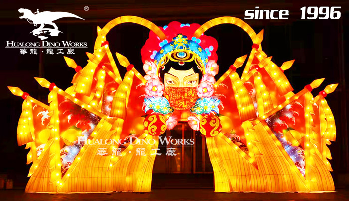 Zigong lantern show production company:Steel frame structure, silk frame modeling,some part with LED hooking,3D modeling,chromatic silk and satin seperated pastin,in magnificent and colorful appearence.