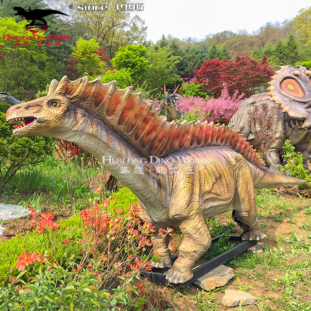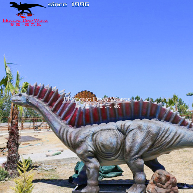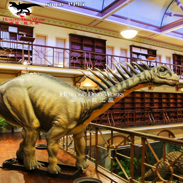 Cute electromechanical simulation of the Amagasaurus in a dinosaur museum abroad.Amagasaurus was a strange lizard-footed dinosaur with two rows of long bristly spines on its back that lived in South America during the Lower Cretaceous. At about 10 meters long, it was a four-legged herbivorous dinosaur.