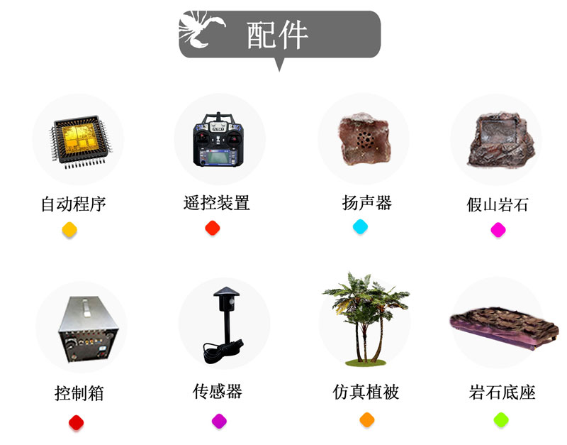 Accessories:Control box, Rockery decoration, Sound box, Remote control and infrared control, Sensor, and spare components
