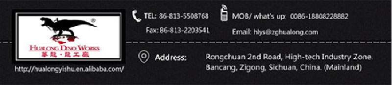 Steel frame structure inside;direct current to control movements,;skin made of high density foam;manual modeling、carving,、rubber silicone covering and color painting.All above is to make a vivid and lifelike moving models, as well has the properties of waterproof、fireproof、antifreeze and high temperature resistance.